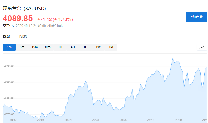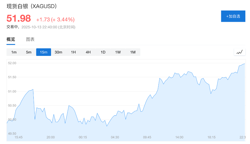 现货黄金日内大涨2.00%,一度升至4090.64美元/盎司,再创历史新高。与此同时,白银市场出现更为剧烈的价格波动,现货白银突破52美元/盎司,再创历史纪录新高,日内涨4.07%。