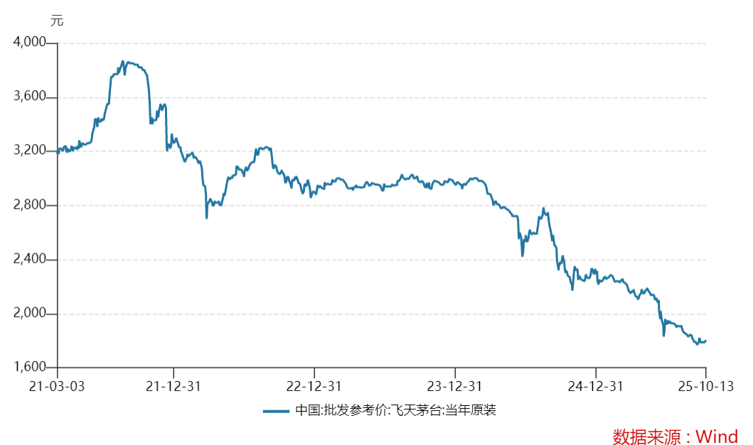根据wind数据,21年的时候茅台散飞价格还在3000元上方,22年和23年还在2500元上方,24年也维持在2100元上方,如今进了2025年,茅台散飞价格可谓一路向下,目前已经来到1800元下方,是否止跌尚未可知。