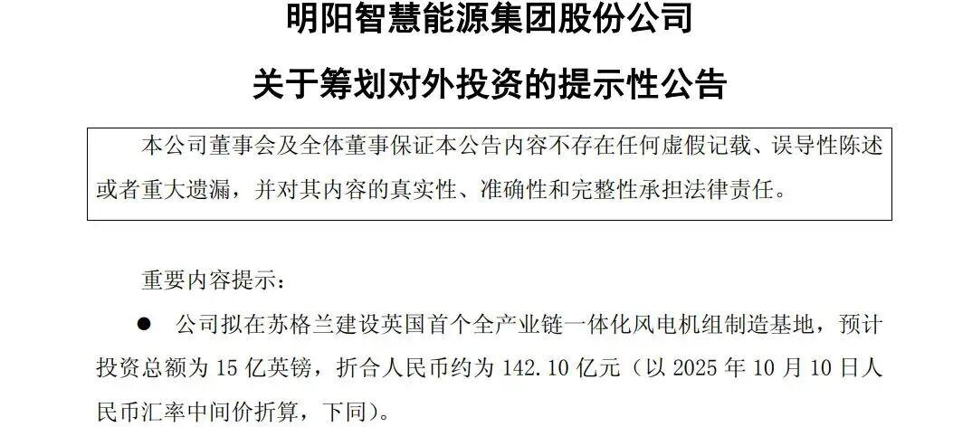 在公告中,明阳智能还表示已就上述投资计划与英国政府和苏格兰政府进行了深入讨论,并且与英国国家能源公司、国家财富基金、苏格兰国家投资银行、英国王室地产署以及英国出口信贷署进行了详细的商业磋商。