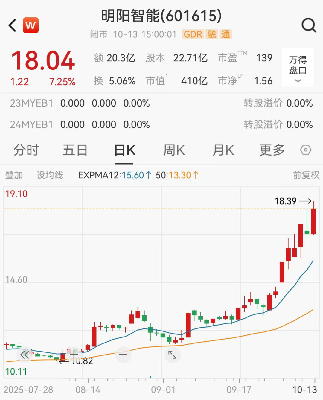 二级市场对明阳智能“重仓”英国海风市场报以积极回应。10月13日收盘,该公司A股股价报收18.04元/股,大涨7.25%,最新市值410亿元。