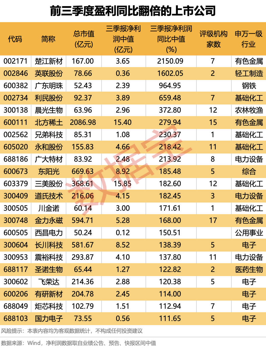 从净利润变动看,以报告数据/预告中值统计,共计22股前三季度盈利同比翻倍增长。楚江新材、英联股份、广东明珠、利民股份、晨光生物5股净利润同比增幅超过300%,依次为2150.09%、1602.05%、964.95%、659.48%、372.8%。