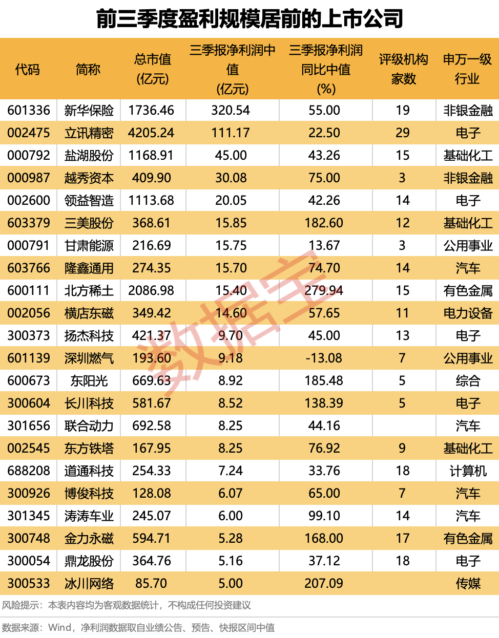 从净利润规模看,以报告数据/预告中值统计,共计22股前三季度盈利超5亿元。新华保险、立讯精密两股前三季度净利润超过100亿元,分别为320.54亿元、111.17亿元;盐湖股份、越秀资本、领益智造净利润均在20亿元以上,依次为45亿元、30.08亿元、20.05亿元。