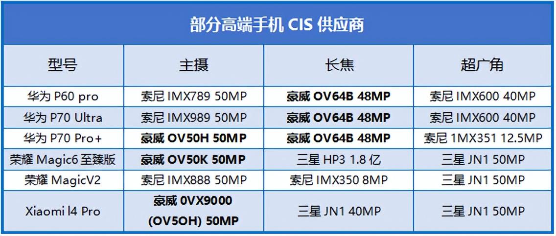 而豪威集团则彻底打破了索尼的垄断,如今华为高端的P70系列以及最新的三折叠手机,还有小米的高端机型14系列,都采用的是豪威集团的CIS作为主摄与长焦。