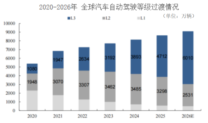 在车载端,自动驾驶等级正从L2向L3快速演进。预计到2026年,全球L3级别汽车数量与2023年相比将接近翻倍。