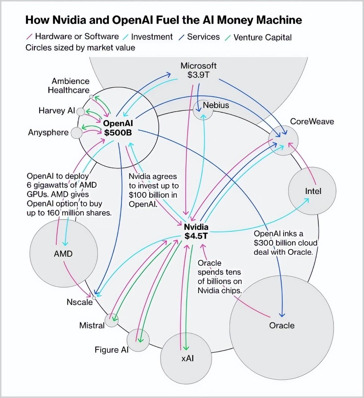 英伟达斥资千亿美元投资OpenAI布局AI系统,OpenAI转而将千亿美元投入甲骨文购买云计算服务,甲骨文又转身向英伟达采购千亿美元芯片。
