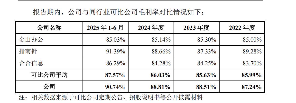 关于企查查与同行业可比公司毛利率的对比情况,招股书显示,报告期内,该公司毛利率整体上与金山办公、指南针、合合信息毛利率大致相当,公司毛利率整体处于可比区间。