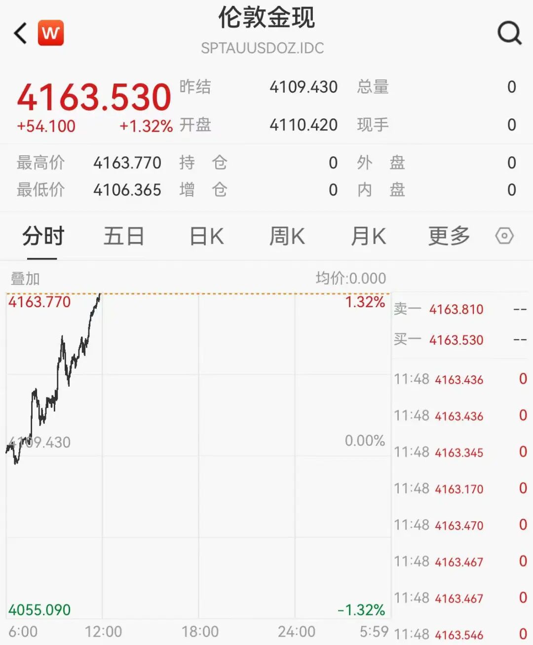 今日,现货黄金首次涨至4160美元/盎司关口,日内涨超1.3%,年内累计上涨超1500美元。