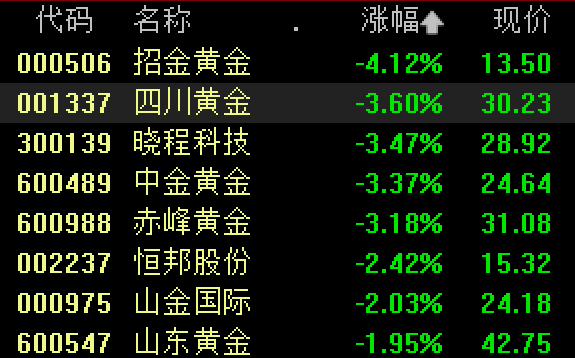 10月14日午后,黄金股全线回落, 紫金矿业 跌超5%,早盘股价一度创历史新高。 招金黄金跌超4%,中金黄金 、山东黄金 、 赤峰黄金 、 四川黄金 等集体下挫。
