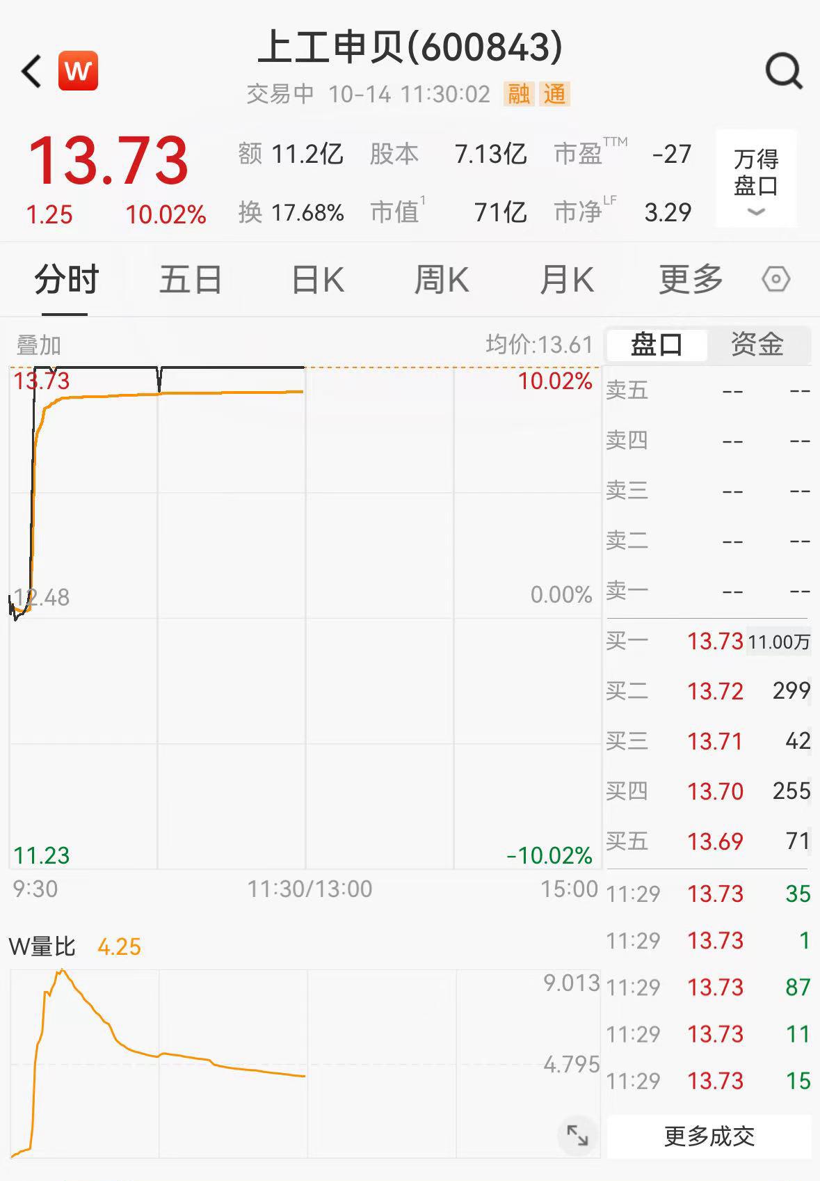 10月14日,上工申贝(600843.SH)股价迅速涨停,报13.73元/股。