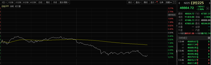 日本三大在野党下午或举行干事长会谈,市场关注主张财政扩张的执政自民党总裁高市早苗能否当选首相,日经指数午后杀跌超千点,跌幅一度超过3%,并成为亚太市场跌幅最大的主要股指。软银一度跌5.8%,索尼及日立一度跌3.5%及4%。