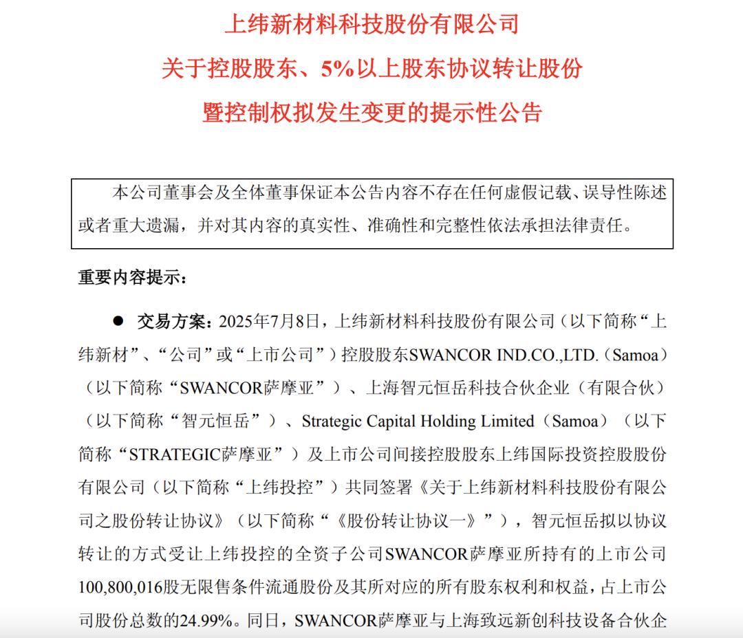 7月9日,科创板上市公司上纬新材发布公告称,智元机器人拟收购其至少63.62%、至多66.99%的股份。交易完成后,智元恒岳将成为控股股东,智元创始人邓泰华将成为上纬新材的实际控制人。