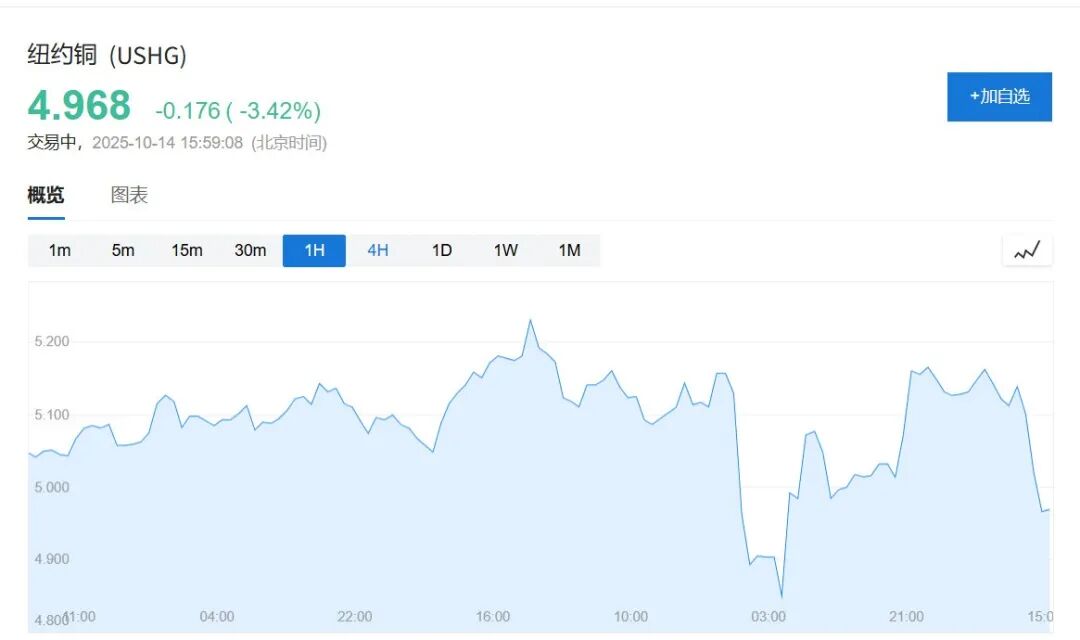 纽约期铜日内一度跌近4%,现报4.968美元/磅。
