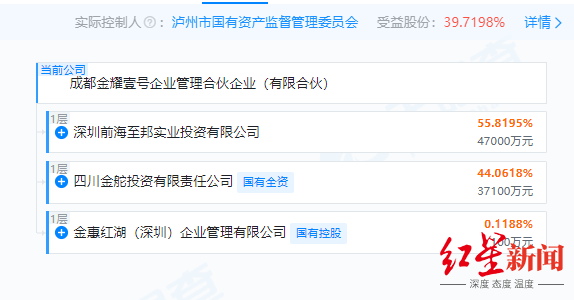 天眼查App显示,成都金耀壹号是⼀家成立于2025年2月21日的有限合伙企业,由深圳前海至邦实业投资有限公司、泸州老窖旗下四川金舵投资有限责任公司、金惠红湖(深圳)企业管理有限公司共同出资,经营范围为企业总部管理、企业管理、信息咨询服务等。公司实际控制人为泸州市国资委,其总持股比例为39.7198%。