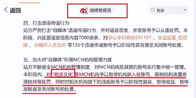 值得一提的是,近期微博管理员的官方处罚通报中,也出现了乾派文化的名字,微博对其进行了“暂停机构新入驻账号、限制机构流量资源扶持等处罚,同时对相关机构旗下的违规账号予以阶段性禁言、暂停收益、暂停涨粉直至半闭账号的处置。”