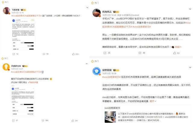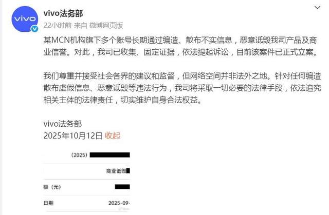 10月12日,vivo法务部官宣:“某MCN机构旗下多个账号长期通过编造、散布不实信息,恶意诋毁我司产品及商业信誉。对此,我司已收集、固定证据,依法提起诉讼,目前该案件已正式立案。”