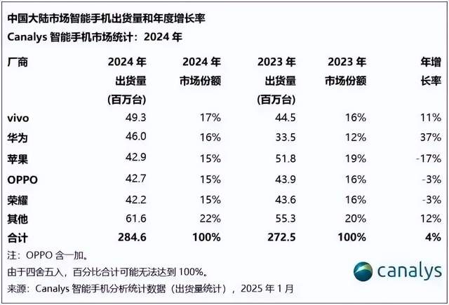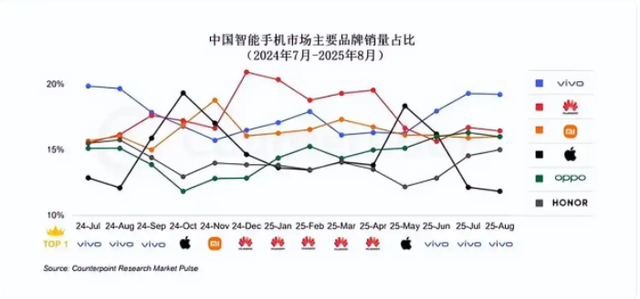 来自Counterpoint和Canalys的全年统计数据显示,2021-2024年,vivo连续四年拿下了中国市场的销量第一名,持续领跑整个手机行业;另据权威机构最新数据显示,vivo以18.4%的市场份额登顶2025年第三季度销量冠军,并且以17.2%的份额拿下2025年前三季度的第一;如无意外,四季度vivo将继续延续优势,最终或创造连续5年中国市场第一的奇迹。