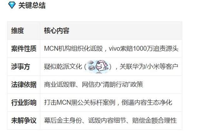 尽管vivo并未公布该MCN机构具体是哪家?以及具体索赔金额,但眼疾手快的媒体和网友们已经通过关键词的检索,第一时间把涉诉金额与涉事MCN机构的“老底”给扒了出来,针对#vivo起诉某MCN诋毁索赔近千万#等相关话题,微博官方AI智搜的总结如下: