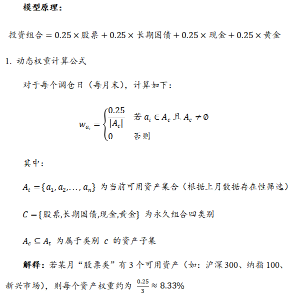 本文参考Harry Browne原版永久投资组合,采用等权配置(各25%)四大类资产:权益及类权益、固定收益、现金、黄金,且各大类下的资产小类亦按等权分配。
