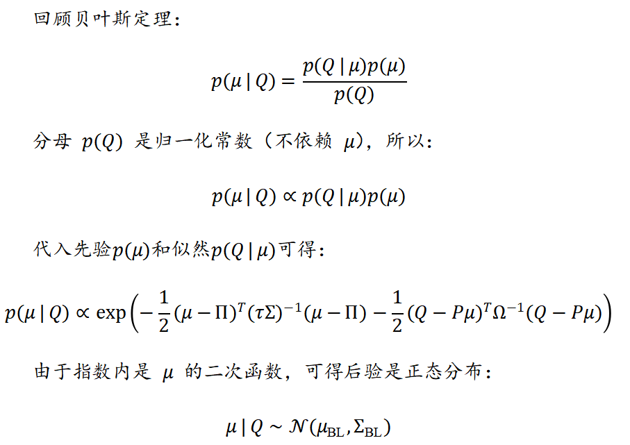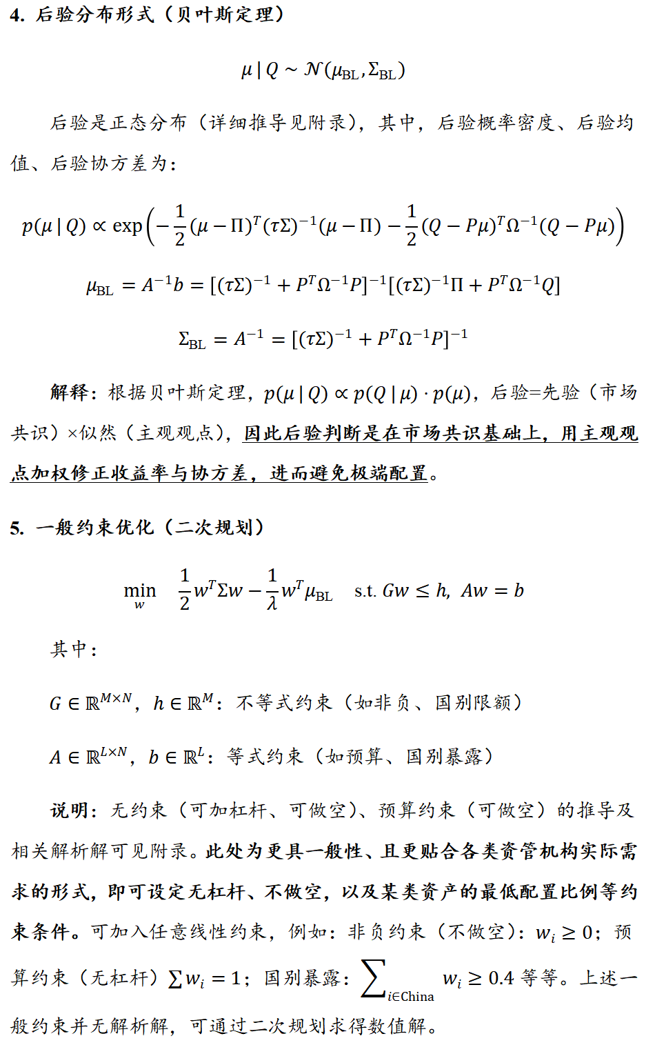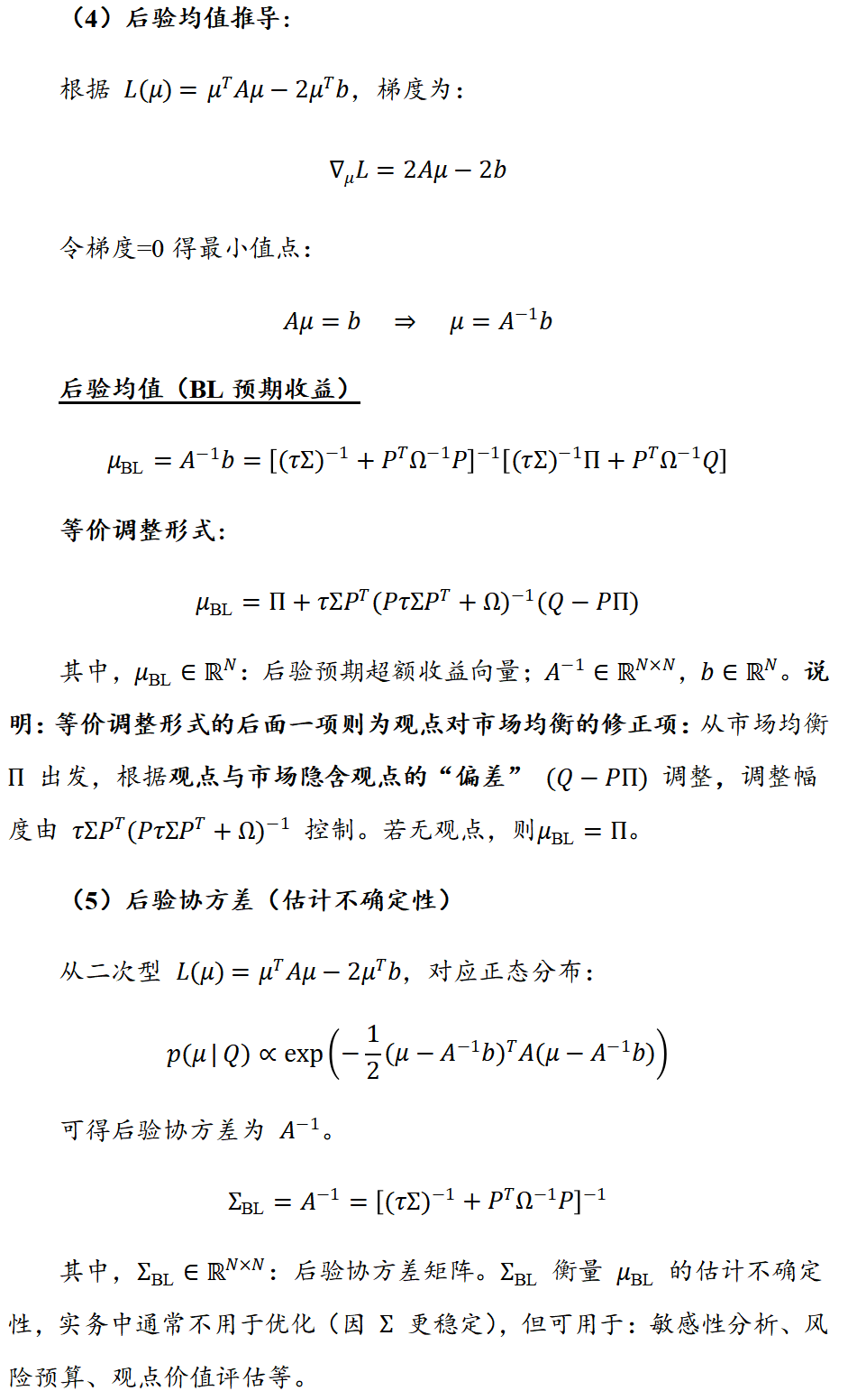 BL模型基于贝叶斯方法,核心是整合两类关键信息以优化预期收益输入:一是市场均衡收益(先验信息),无需投资者直接预测资产绝对收益,而是通过全球市场组合权重反推隐含的市场均衡收益率,作为市场共识的中性基准;二是投资者主观观点(最大似然),提供结构化框架允许投资者以绝对或相对形式表达对资产未来表现的前瞻性判断,并明确观点的信心水平。两类信息经贝叶斯整合后生成综合预期收益向量(后验收益),作为MVO模型输入进行组合优化,最终输出的权重通常更稳定、分散且契合投资直觉。