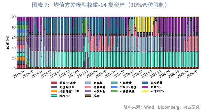 本文采用滚动4年的历史数据计算资产的预期收益率与协方差矩阵,而对大多数资产而言,4年时长已足以形成一个小周期。我们设计了两个版本的均值方差模型:(1)均值方差-无仓位限制版本(作为基准版本):不设置单个资产的仓位上限;(2)均值方差-单资产30%限制版本:在无仓位限制版本的基础上,增设单个资产30%的权重上限。同时,将等权配置模型作为参照模型,用于与上述两个均值方差模型版本进行对比分析。