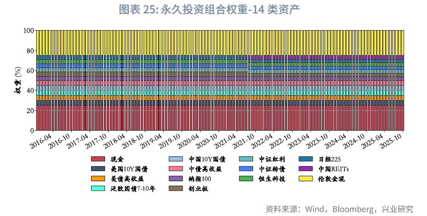 进一步分散的永久投资组合,通过股票(权益和类权益)、债券、现金和黄金的等比例配置,力求覆盖不同经济环境,实现极致分散和低波动。该方法的优点是对经济周期具有较强的适应性,回撤控制较好,但缺点在于在权益牛市阶段明显跑输股市,长期超额有限。因此,该组合更适合养老金、家族信托以及追求财富保值的保守型个人投资者。国外养老金较少将其作为核心框架,更多用作低风险参考组合。
