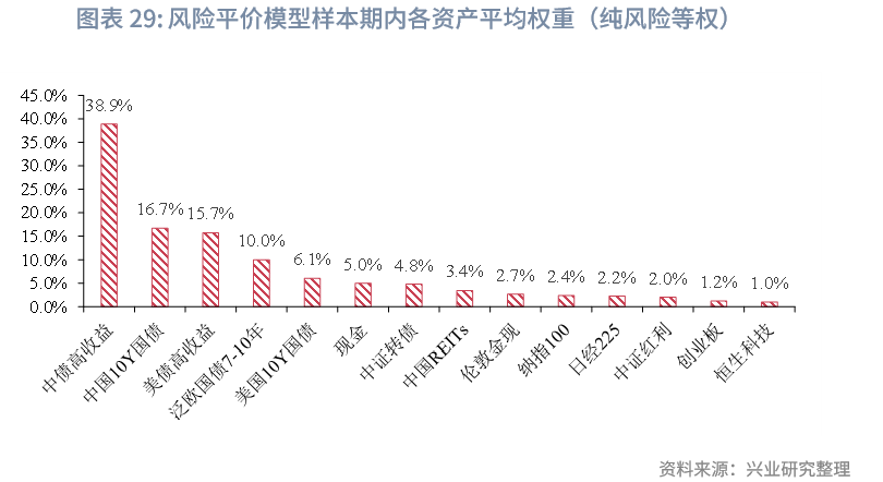 考虑到不同资产间可能存在较高相关性(从大类资产配置视角看具备较强替代性),因此本文在进入具体配置模型前,先通过相关性矩阵分析对上述初步确定的18类大类资产开展二次筛选,保留低相关资产,筛选结果如下:(1)在美国10年期国债与美债投资级两类资产中,最终选定美国10年期国债。二者相关系数达0.98,且美国10年期国债通常充当市场利率标杆,跟踪该资产的基金产品更为丰富,因此确定保留美国10年期国债指数;(2)纳指100与标普500指数的相关性为0.96,其中纳指100更能反映全球科技行业发展趋势,故本文选择纳指100作为配置标的,但在具体实践场景下,二者也可实现相互替代;(3)德债7-10年指数与泛欧国债7-10年指数的相关性达0.96,考虑到泛欧国债涵盖法国、意大利等多国国债,覆盖范围更广泛,本文选择泛欧国债7-10年指数;(4)日经225与德国DAX指数均代表非美发达国家资本市场,从与其余资产的相关性角度考量,日经225具备更强的分散配置价值,因此本文选定该指数。经上述筛选剔除后,最终剩余14个资产子类,分别为:现金、美国10年期国债、美债高收益、中国10年期国债、中债高收益、泛欧国债7-10年、创业板、中证红利、恒生科技、纳指100、日经225、中证转债、中国REITs、伦敦金现。
