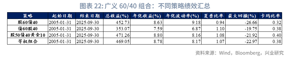 为了考虑流动性,我们设计了三个版本的广义60/40组合模型:(1)股60债40:固定现金仓位5%,95%可配置资产中股票占比60%、债券占比40%;(2)债60股40:固定现金仓位5%,95%可配置资产中债券占比60%、股票占比40%;(3)股50债40黄金10:固定现金仓位5%,95%可配置资产中股票占比50%、债券占比40%、黄金占比10%。