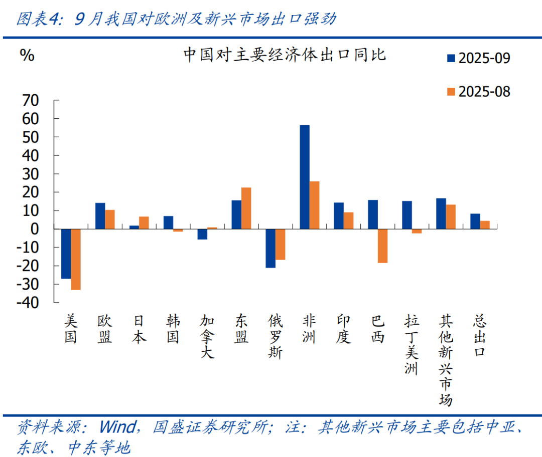 1)发达经济体,9月我国对美出口维持低位,同比降27.0%,降幅与上月接近,拖累出口4.2个百分点;9月我国对欧盟出口增速进一步回升3.8个百分点至14.2%,与基数回落有关,拉动出口2.0百分点。