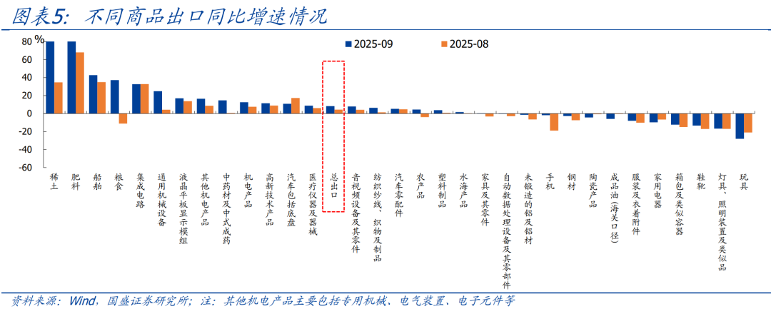 4、进口看, 9月进口同比大升至7.4%、创近一年半来新高,季度同比也从连续三个季度负增后首次转正,铜矿&铁矿等工业金属、集成电路是主拉动。5、往后看,展望四季度出口,制约主要是高基数、近期中美关税再升级的扰动、以及对美出口降幅可能仍大,支撑主要来自非洲、东盟、欧盟、拉美等非美区域,产品结构偏强的预计还是电子中间品、机械、交运设备等;综合看,预计四季度出口同比将有所回落、但大概率延续为正。