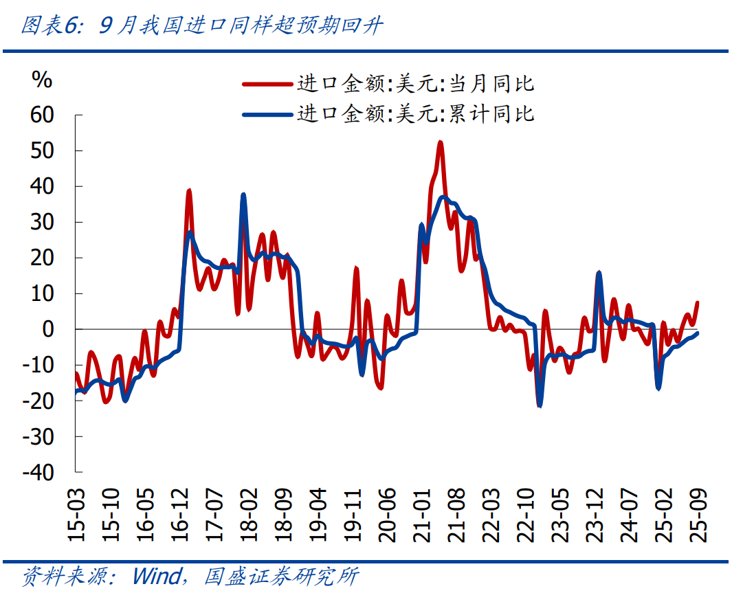 事件:按美元计, 9 月中国出口同比 8.3% ,预期 5.7% ,前值 4.4% ; 9 月中国进口同比 7.4% ,预期 1.4% ,前值 1.3% 。