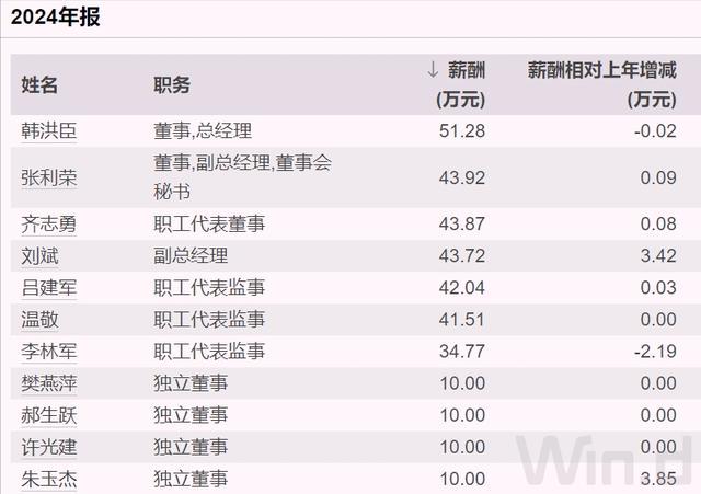 该公司的高管薪酬并不高。原总经理韩洪臣税前薪酬为51万元,其余高管薪酬都低于50万元,独立董事报酬也有10万元。