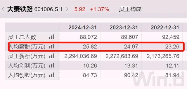 至204年末,大秦铁路职工总数超过8.8万人,去年人均创利10.3万元,人均税前薪酬25.6万元,比2023年增加大约8500元。