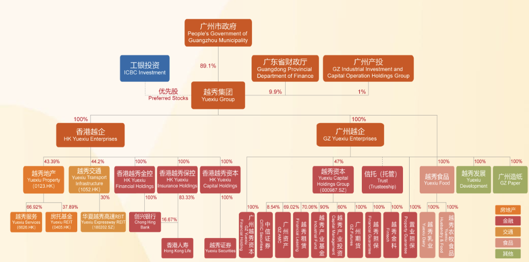 越秀集团于1985年在香港成立,是广州市属国企,股东成员包括广州市政府、广东省财政厅以及广州产投。越秀集团以金融、房地产、交通基建、食品为四大主业,构建了横跨一二三产业的“4+X”现代产业体系。