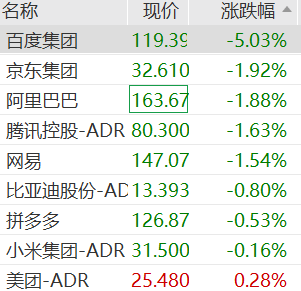 中国金龙指数跌幅一度扩大至3%,截至发稿跌幅收窄至1.6%。小马智行跌超6%,百度跌超5%,文远知行跌超4%,阿里、京东跌约2%。