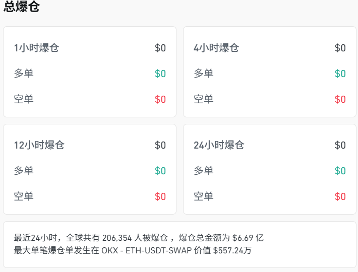 加密货币集体大跌,比特币跌2.25%,以太坊跌破4000美元关口。近24小时内超20.6万人爆仓,爆仓金额近6.7亿美元。