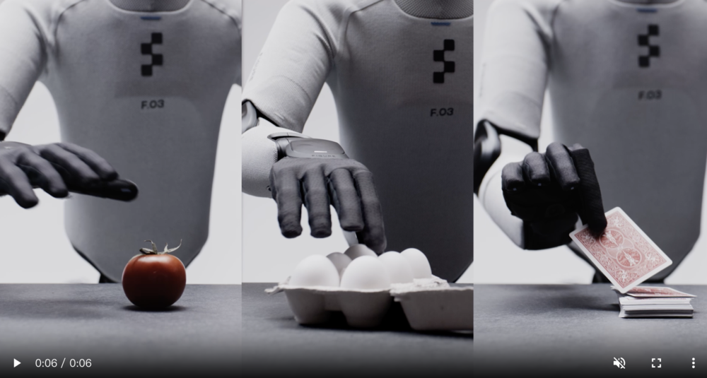不仅如此,机械手的触觉也得到了改良。Figure 03有着更加柔软灵敏的指尖,与物品的接触面积相应扩大,抓取物品变得更加稳定和灵巧。据官方测试,每个指尖传感器都能检测到低至3克的压力,其灵敏度足以感知回形针在手指上的重量。现在,不论是易碎、不规则,抑或是移动着的物体,新一代机器人都能轻松“拿捏”。