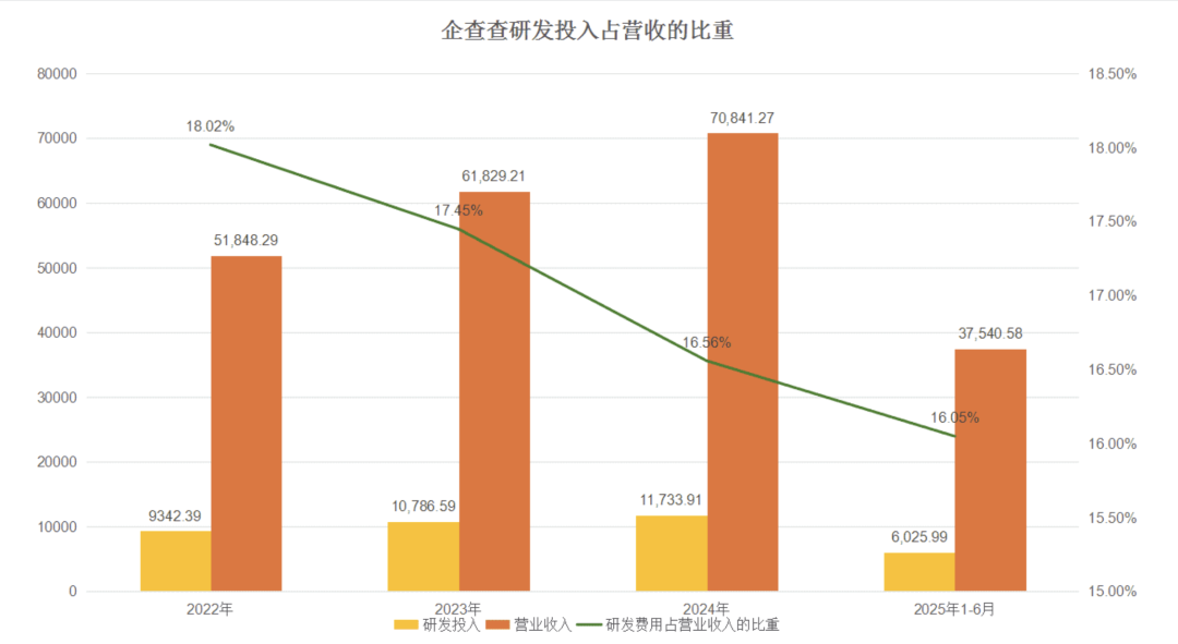 2022年到2024年,公司研发费用呈上涨趋势。不过企查查的研发投入却并没有赶上营收的增长速度,2022年到2025年1到6月,研发投入占营业收入的比例从18.02%一路下滑至16.05%,金额分别为9342.39万元、1.08亿元、1.17亿元和6025.99万元。