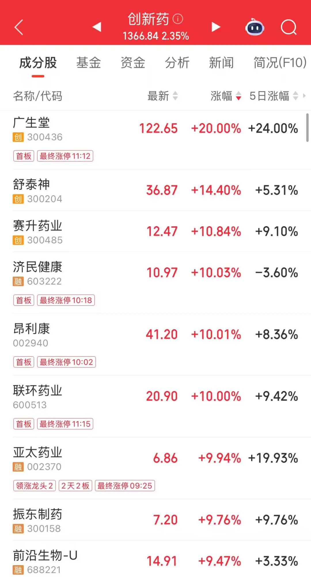 近期持续回调的创新药概念回暖。广生堂20CM涨停,联环药业、昂利康等多股涨停,振东制药、前沿生物等跟涨。