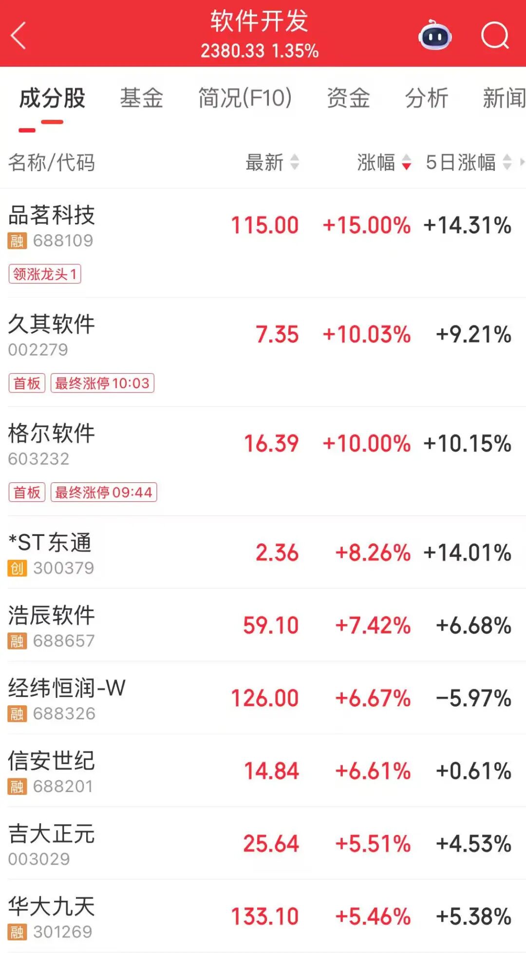 10月15日,国产软件概念震荡拉升,久其软件、格尔软件双双涨停,品茗科技涨15%,浩辰软件、华大九天、信安世纪等多股跟涨。
