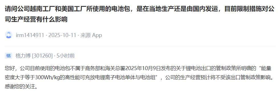 【V观财报|格力博:公司目前使用的电池包不属于出口管制范围】格力博10月15日在投资者互动平台表示,公司目前使用的电池包不属于商务部和海关总署2025年10月9日发布的关于锂电池出口的管制政策所明确的“能量密度大于等于300Wh/kg的高性能可充放电锂离子电池单体与电池组”,公司的生产经营预计将不受该出口管制政策影响。(中新经纬APP)