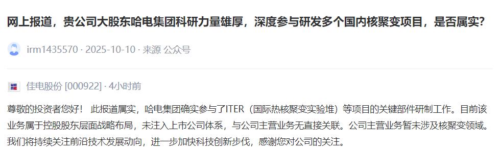 【V观财报|佳电股份:公司主营业务暂未涉及核聚变领域】佳电股份10月15日就“网上报道,公司大股东哈电集团科研力量雄厚,深度参与研发多个国内核聚变项目,是否属实?”相关问题在投资者互动平台表示,此报道属实,哈电集团确实参与了ITER(国际热核聚变实验堆)等项目的关键部件研制工作。目前该业务属于控股股东层面战略布局,未注入上市公司体系,与公司主营业务无直接关联。公司主营业务暂未涉及核聚变领域。(中新经纬APP)