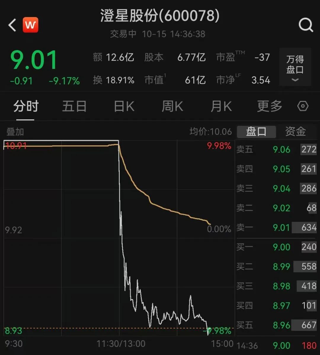 10月15日,澄星股份午后炸板,股价跳水触及跌停,盘中上演“天地板”,成交额超12亿元。