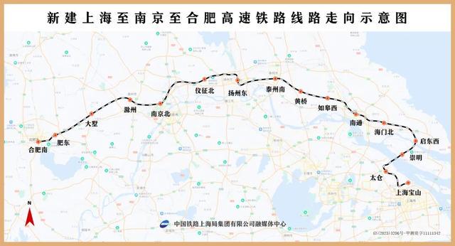 该线路起自新建上海宝山站,经江苏省苏州市、南通市、泰州市、扬州市、南京市,以及安徽省滁州市、合肥市,接入既有合肥南站,线路全长约554公里,设计时速350公里。