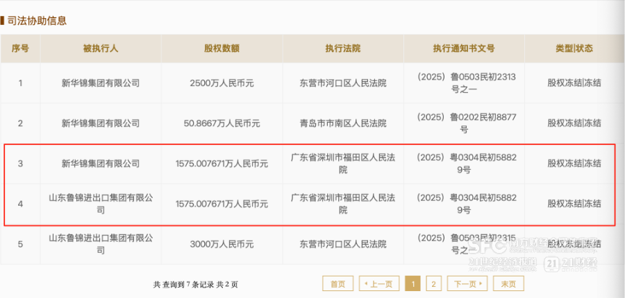 除了10月10日深圳市福田区法院冻结的1575万元股权外,9 月以来新华锦集团和鲁锦集团还有其他6笔冻结记录,涉及股权从50.8万元至3000万元不等,执行法院分别是山东省东营市河口区人民法院、江苏省连云港市海州区人民法院和青岛市市南区人民法院。