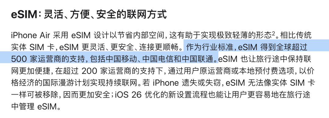 如今,随着三大运营商官宣正式获得开展eSIM手机运营服务商用试验的批复,iPhone Air在中国大陆的销售将不再受到限制。苹果官网最新内容显示,作为行业标准,eSIM得到全球超过500家运营商的支持,包括中国移动、中国电信和中国联通。