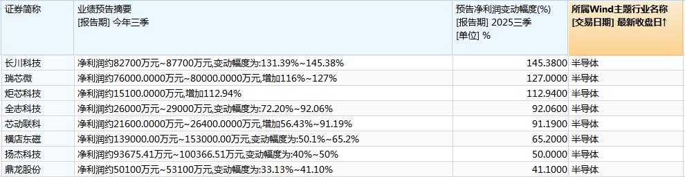 另有8家半导体行业公司预计前三季度业绩向好,其中3家净利润预增超100%。