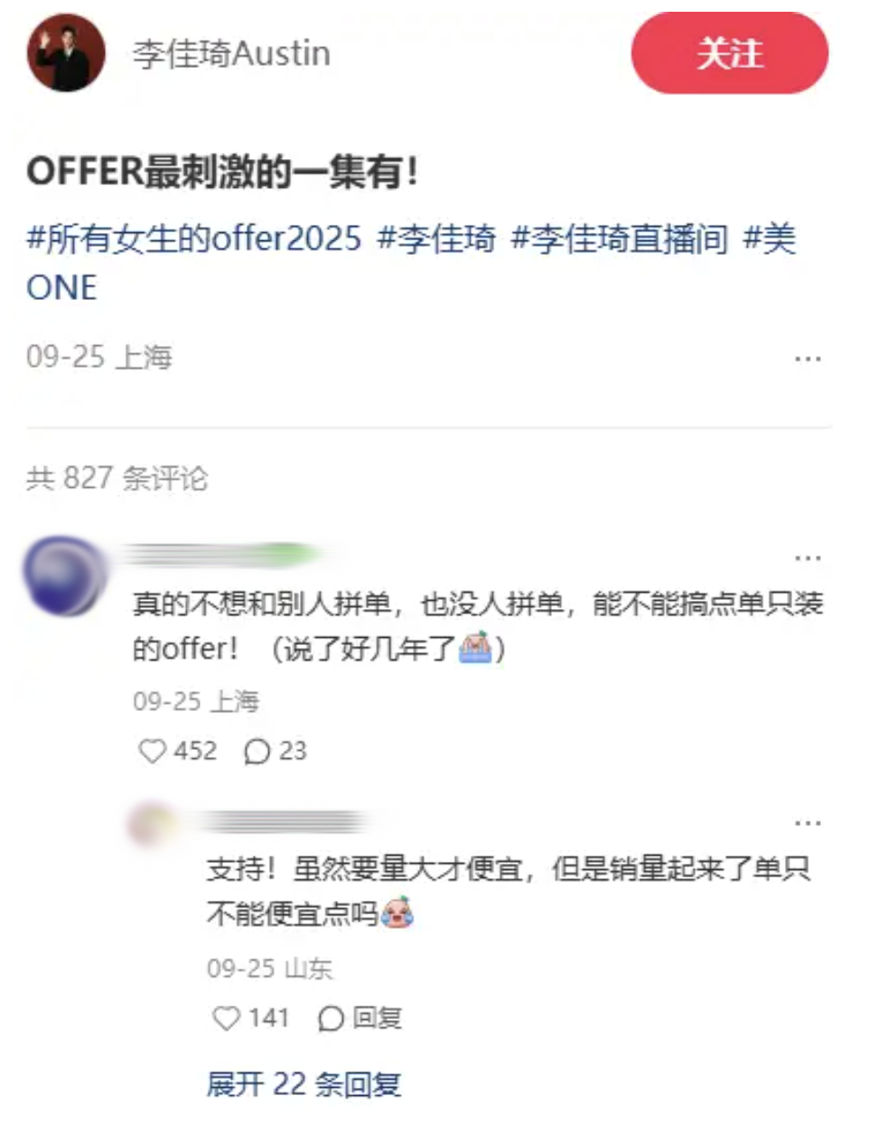再说一遍没有很多人可以分享,建议李佳琦直接开发一个拼单平台,想要好价好产品的所有女生在上面自动成团。”