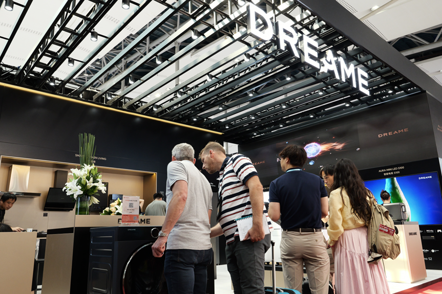 在广交会现场,追觅展台前排起长队,海外采购商争相体验新品。一位欧洲分销商称赞:“这是最具创新性的洗衣机,完美融合科技与美学,代表行业未来方向。”
