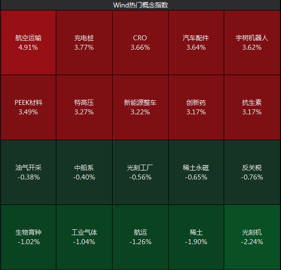 板块方面,航空运输、创新药、机器人、充电桩等涨幅居前,光刻机、稀土等跌幅居前。