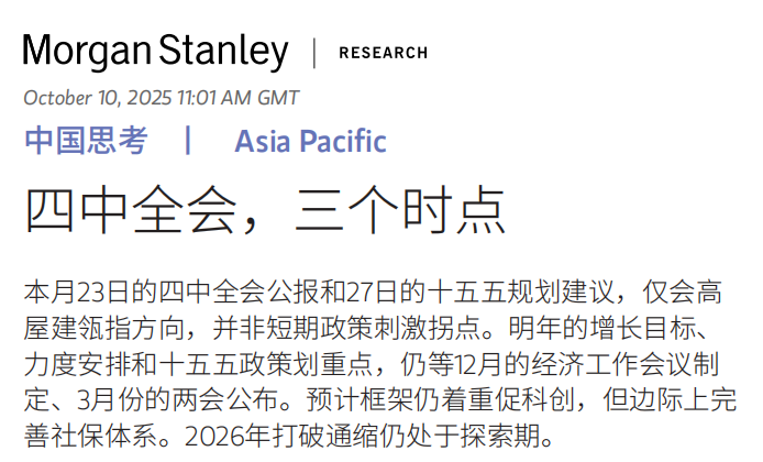 四中全会将发布两份关于十五五规划的重要文件:中国将于10月20-23日召开四中全会。10月23日将发布一份《公报》(约5,000-6,000字),高屋建瓴地为未来五年指引方向。随后或将在10月26-27日发布更详细的《中共中央关于制定国民经济和社会发展第十五个五年规划的建议》(约2万字),提供更具体的产业政策和结构性改革指引。